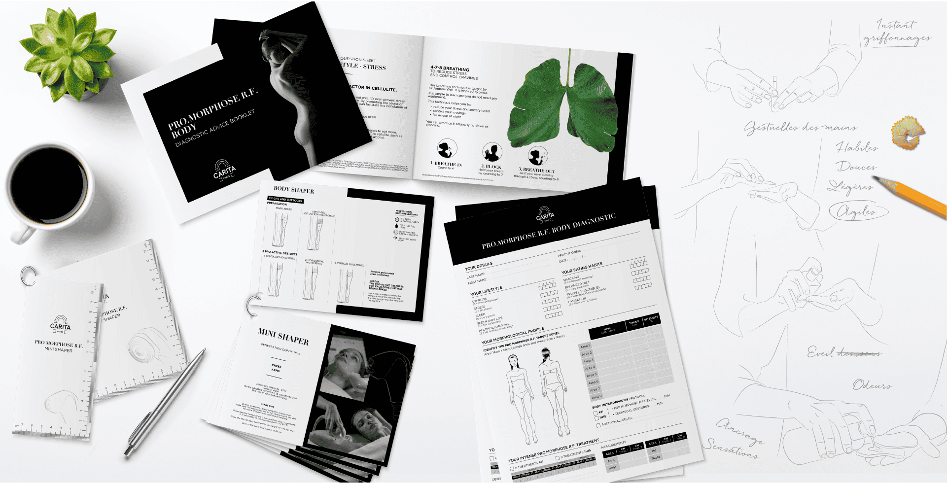 Supports print : protocoles de soin, manuels, fiches pratiques... chaque document est conçu de A à Z, dans le respect de la charte graphique Carita, avec des mises en page élégantes et fonctionnelles, des illustrations précises et des pictogrammes sur mesure.