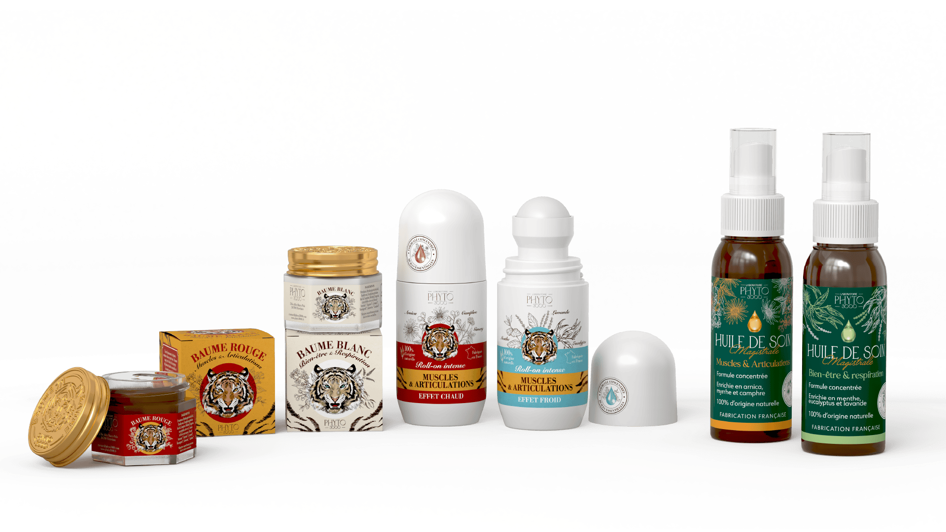 Le repositionnement s’est aussi opéré sur les huiles complémentaires, trop longtemps perçues comme de simples déclinaisons. En créant une véritable segmentation entre roll-on et spray, nous avons affirmé leur spécificité (effets thermiques, vertus ciblées) par un traitement graphique distinct mais cohérent avec la gamme. Des codes couleur pour différencier les effets, une meilleure hiérarchie des messages et la mise en avant des plantes actives permettent de clarifier chaque usage tout en renforçant la reconnaissance visuelle.
